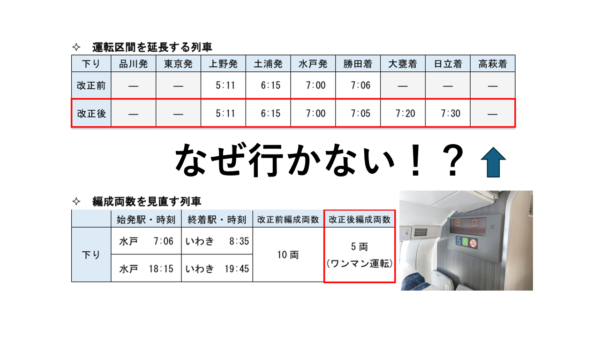 さらに、老朽化したE501系10両を運用から外すため、水戸07:03発いわき行きはE531系5両に短編成化されます。